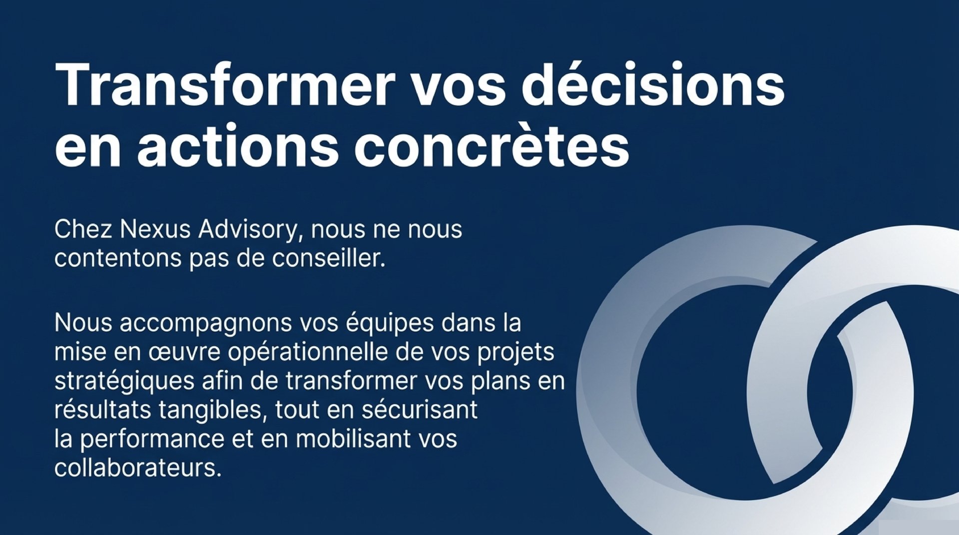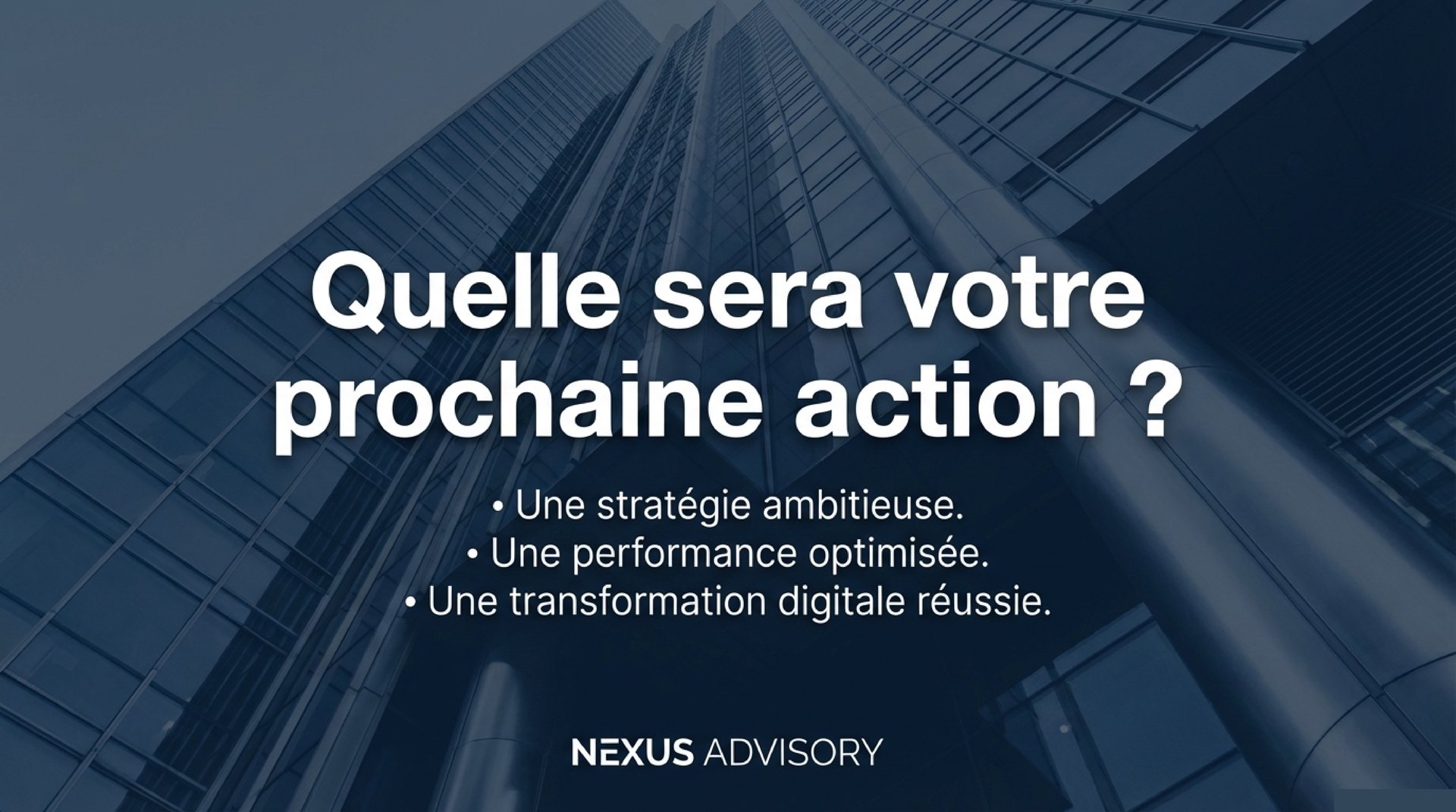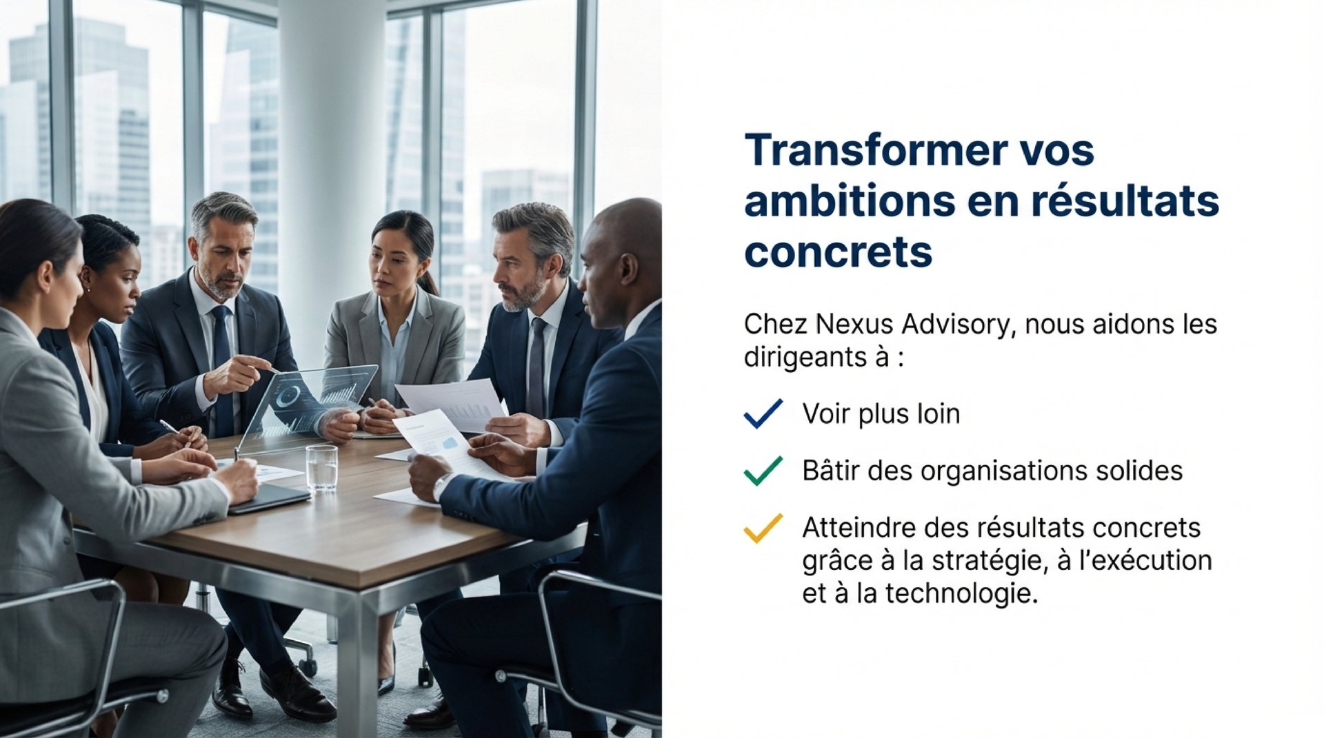 Chez Nexus Advisory, nous aidons les dirigeants à voir plus loin, à bâtir des organisations solides et à transformer leurs ambitions en résultats concrets grâce à la stratégie, à l'exécution et à la technologie.