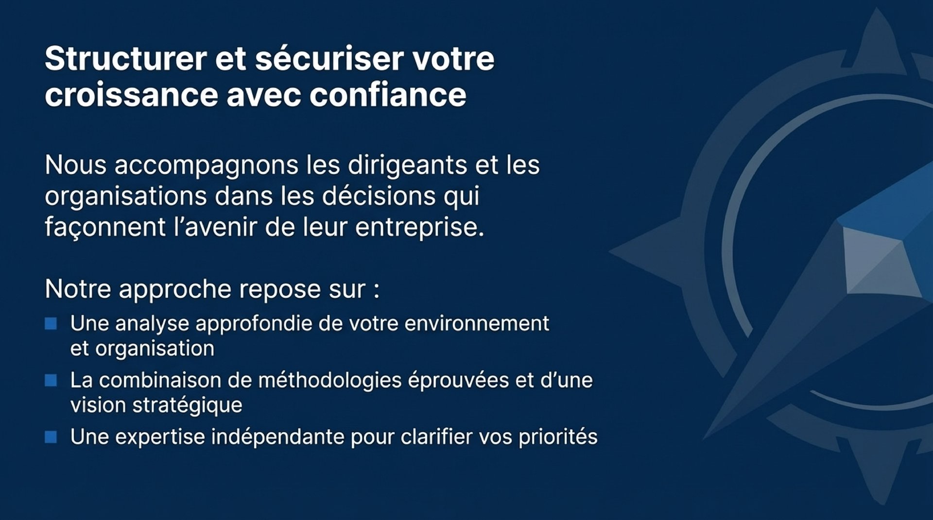 Structuration d'organisations, pilotage de croissance, gouvernance, positionnement marché. Une expertise forgée dans le conseil et la finance, au service de dirigeants qui veulent passer à l'action.