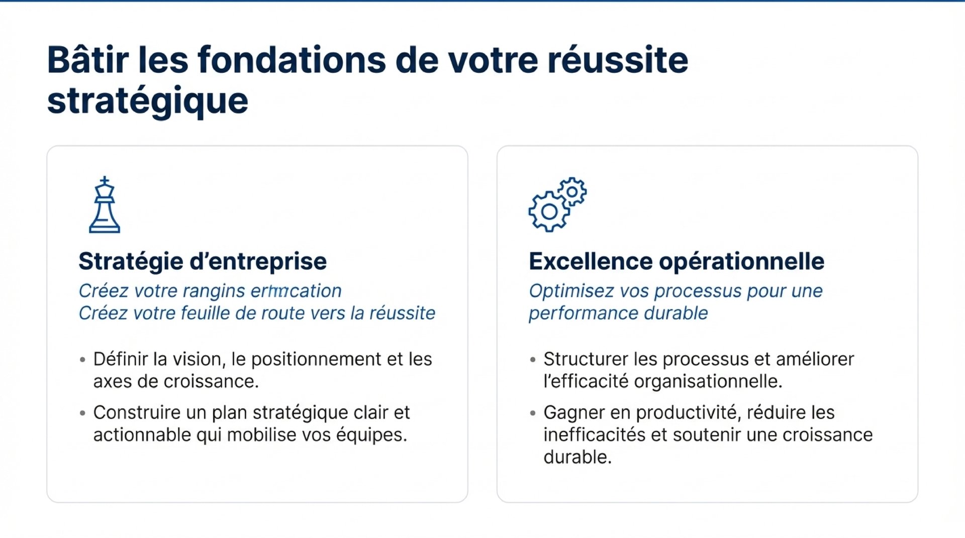 Nous co-construisons avec vous une stratégie claire et actionnable. Positionnement, structuration, gouvernance — chaque décision est pensée pour créer de la valeur durable.