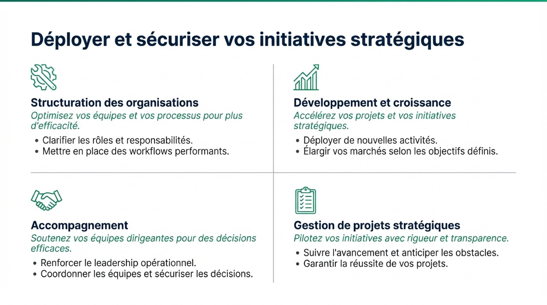 Nous accompagnons les entreprises dans le déploiement de leurs projets de croissance, le lancement de nouvelles activités et l'expansion de leurs marchés. Chaque action est guidée par les objectifs stratégiques définis.
