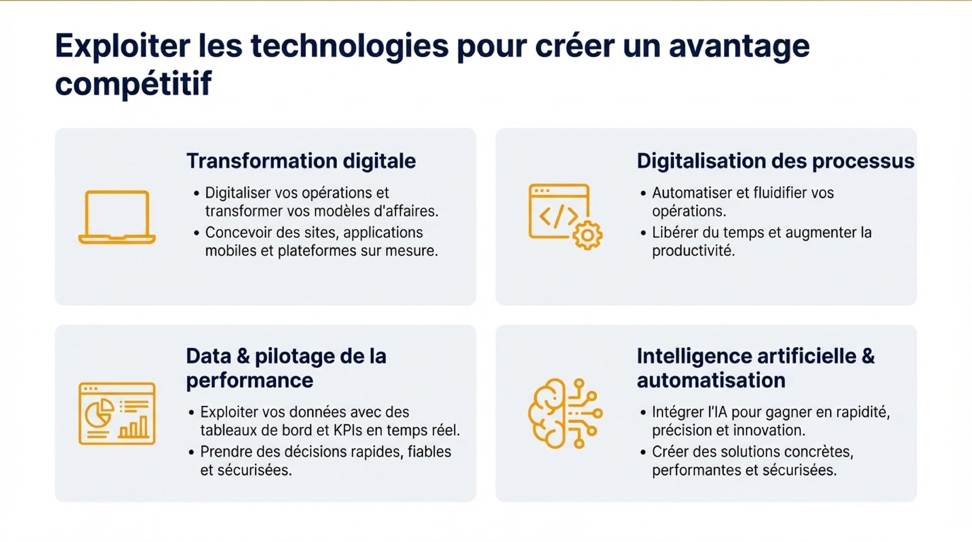 Digitaliser vos opérations, développer vos sites et applications, et transformer vos modèles pour une croissance durable.