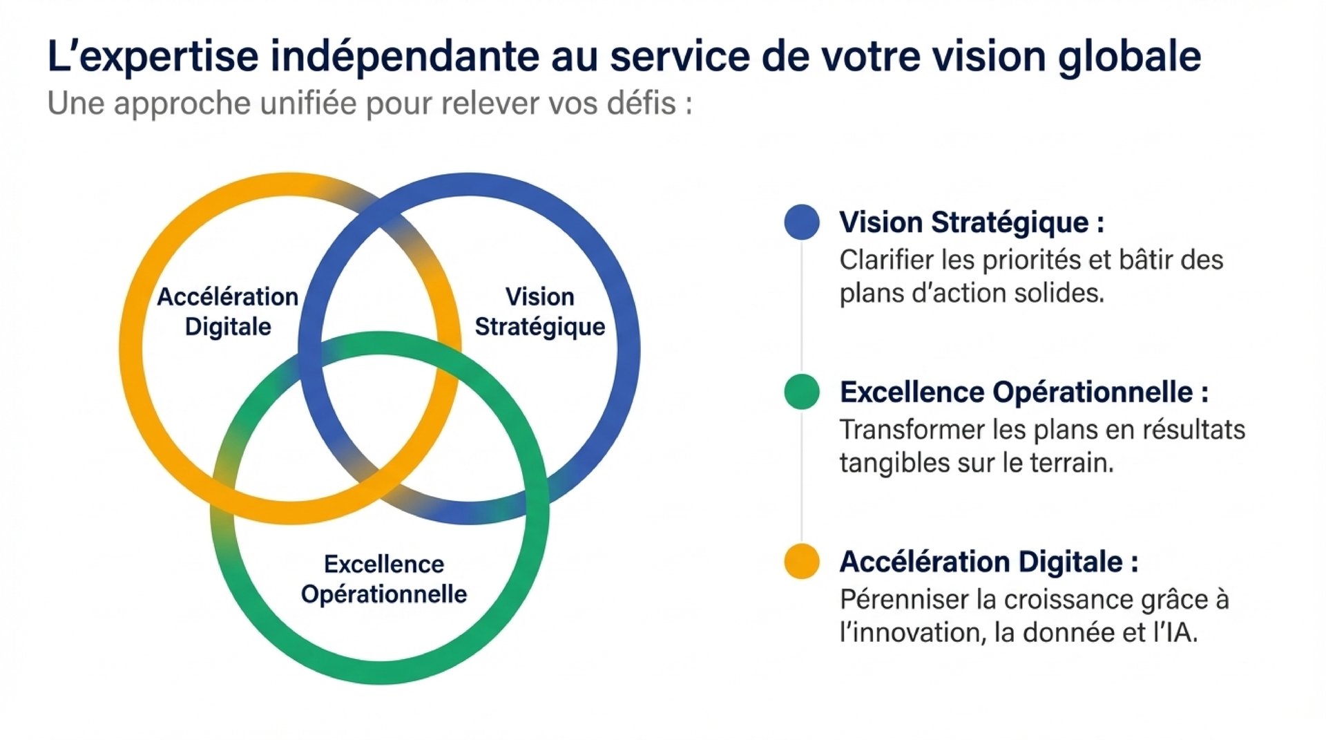 Notre approche repose sur une analyse approfondie de votre environnement, de votre organisation et de vos opportunités de développement. En combinant méthodologies éprouvées, compréhension du terrain et vision stratégique, nous aidons les entreprises à clarifier leurs priorités, sécuriser leurs décisions et bâtir des organisations solides, capables de soutenir une croissance durable.